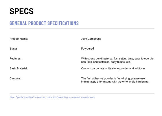 Fasergipsplattendichtungsmasse ist ein Verpfändungsmittel, das benutzt wird, um Fasergipsplatten zusammen zu verbinden. Zuzutreffen kann auf den niedrigen, mittleren und hohen Saughintergründen verwendet werden und ist- einfach zu mischen und. Einige der Eigenschaften der Fasergipsplattendichtungsmasse schließen die ausgedehnte Arbeitszeit ein, einfach zu mischen, verbesserte Pufferzeit für Anpassung, erhöhte Adhäsion mit weniger Verschiebung.