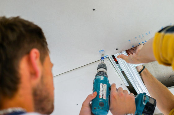 Fasergipsplatte, alias Trockenmauer oder Gipskarton, ist ein Baumaterial, das für die Schaffung von Innenwänden und von Decken benutzt wird. Es wird vom Gipsgips gemacht, der zwischen zwei starke Blätter Papier oder Fiberglasmattierung gedrückt wird.
